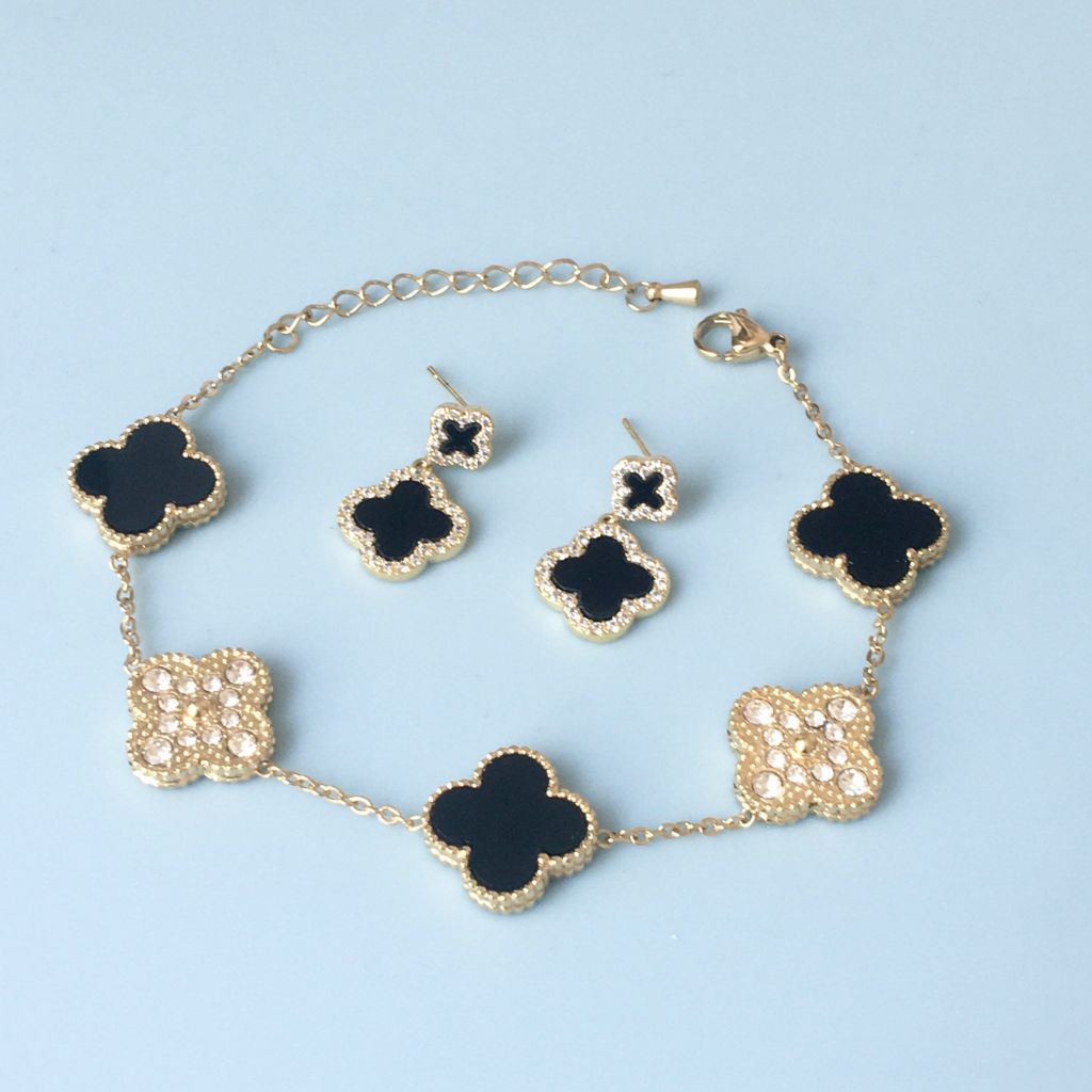 Bộ Trang Sức 2 Mặt Cỏ 4 Lá May Mắn - Vòng Tay & Bông Tai Màu Đen Pha Lê (AG)