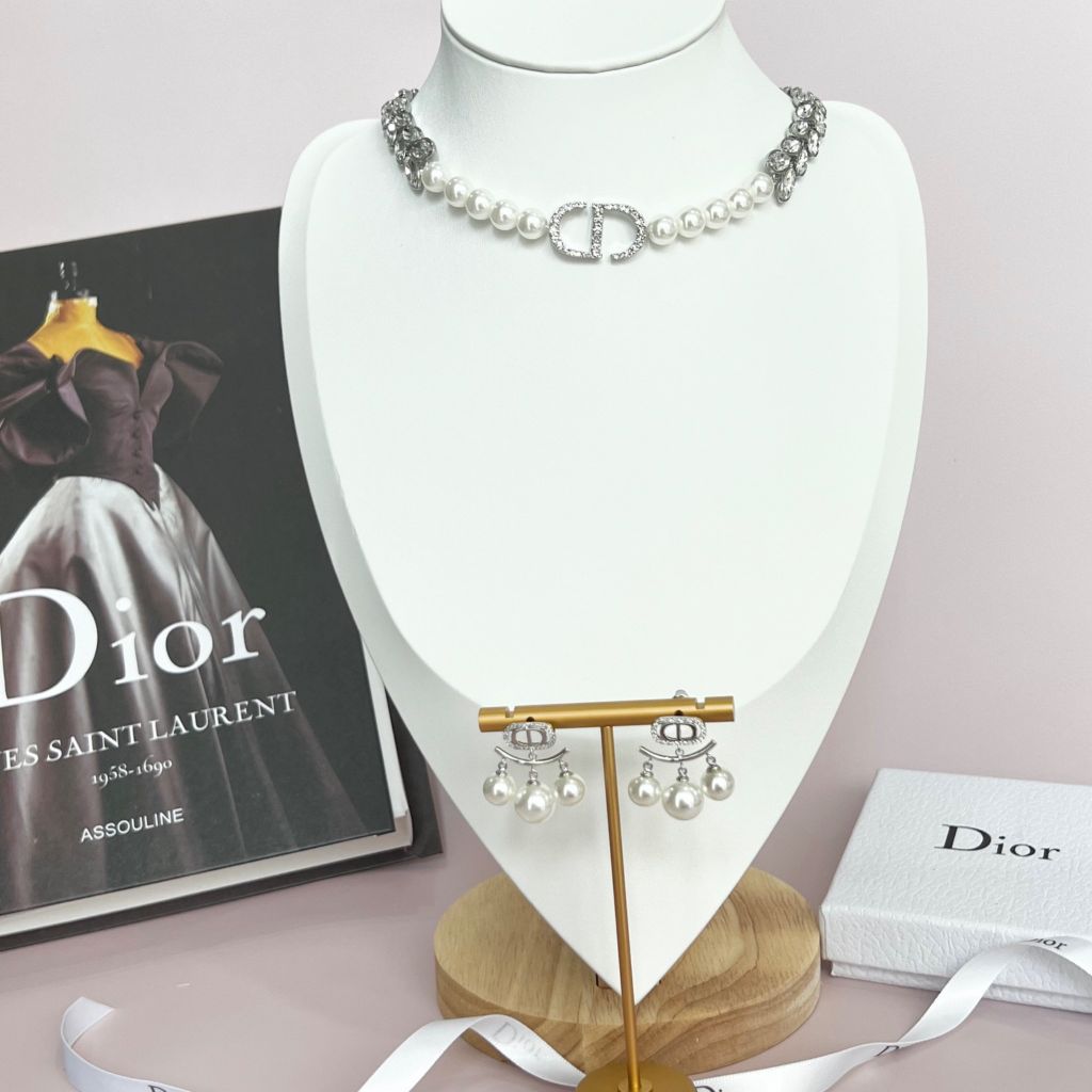 Bộ Trang Sức Dior Trắng - Vòng cổ Choker & Bông Tai Ngọc Trai, Pha Lê Quý Phái (AF)