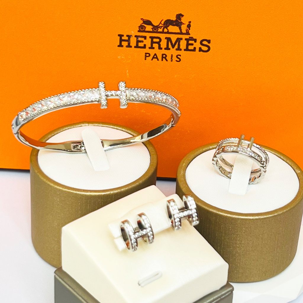 Bộ Trang Sức Hermes Trắng - Vòng Tay, Nhẫn & Bông Tai Pha Lê (AB)