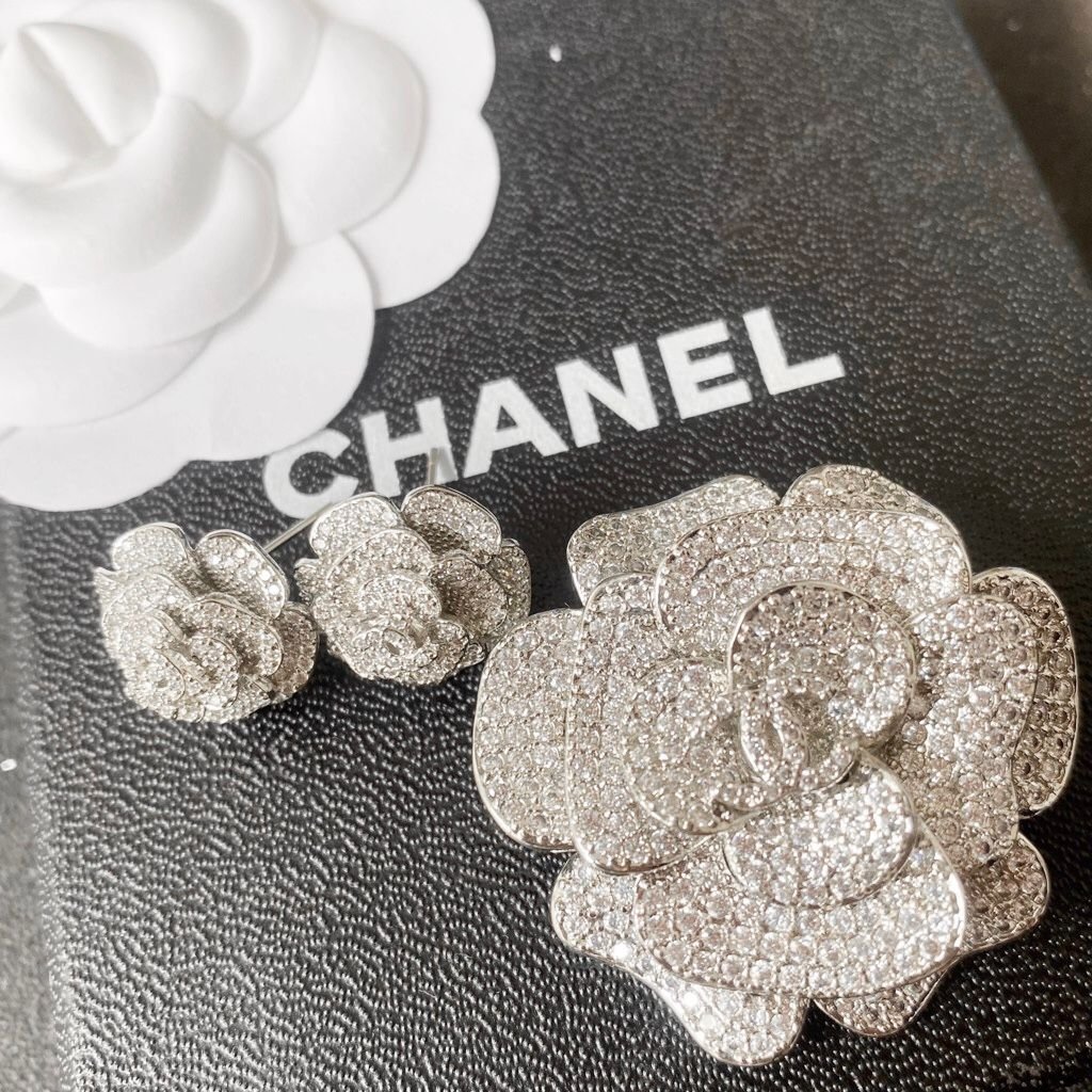 Bộ Trang Sức Hoa Trà Chanel Trắng - Cài Áo & Bông Tai Pha Lê (AJ)