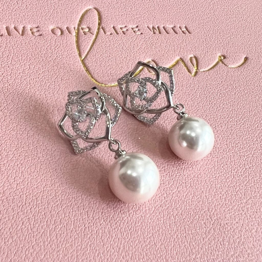 Bông Tai Hoa Hồng Ngọc Trai & Pha Lê Trắng (AL)