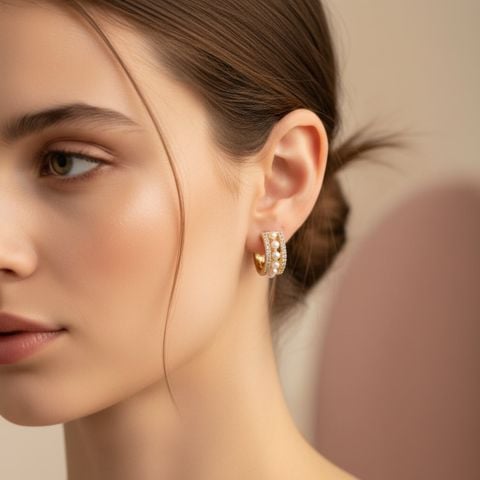 Bông Tai Khoen Tròn Màu Vàng Ngọc Trai & Pha Lê Trắng (AM)