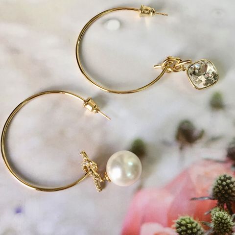 Bông Tai Khoen Tròn To So Le Màu Vàng Ngọc Trai & Pha Lê Trắng Cá Tính (AH)