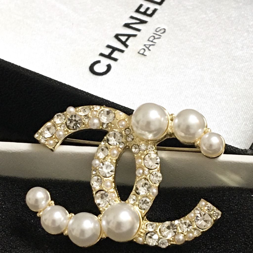 Cài Áo Chanel Màu Vàng Ngọc Trai & Pha Lê Trắng (BI)