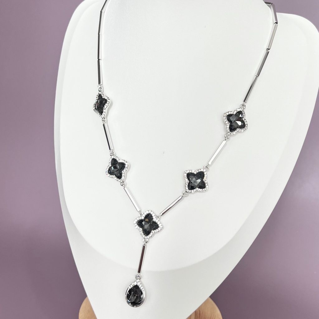 Dây Chuyền Ngắn - Cỏ 4 Lá May Mắn Pha Lê Xanh Rêu Đen & Trắng