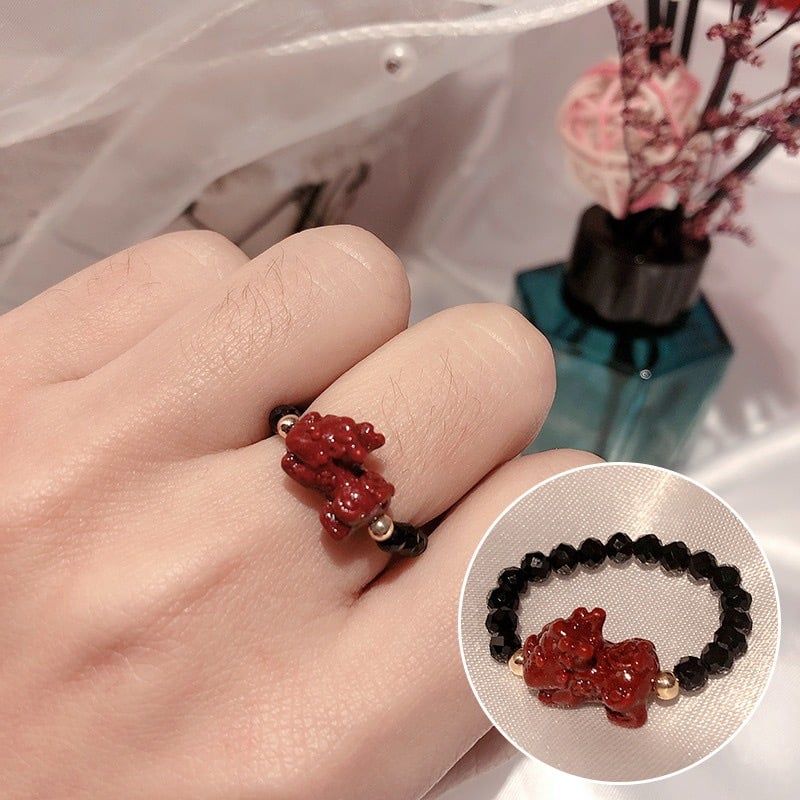 Nhẫn Đá Phong Thuỷ Cao Cấp - Con Tỳ Hưu Đá Chu Sa & Đá Obsidian Thiên Nhiên May Mắn