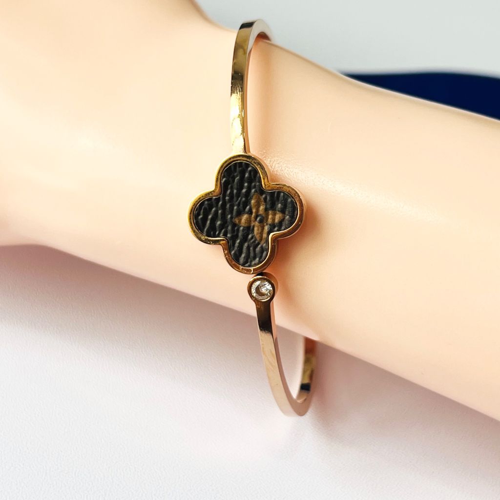 Vòng Tay TiTan Cao Cấp - LV Cỏ 4 Lá May Mắn Bằng Da & Pha Lê (AO)