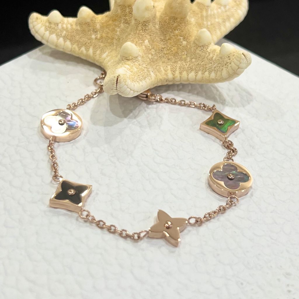 Vòng Tay TiTan Cao Cấp - LV Cỏ 4 Lá May Mắn Màu Vàng Hồng Vỏ Trai Thiên Nhiên (AE)